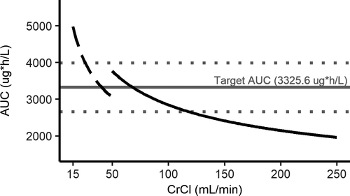 Figure 2The proposed precision dosing strategies are predicted to result in rivaroxaban average 24-hour steady-state area under the plasma concentration-vs.-time curve (AUC) values within ±20% of the target AUC for physiologically relevant ranges of creatinine clearance (CrCl) (15–250 ml/min) in adults. The target AUC (3,325.6 μg/h per liter) is represented by the solid gray horizontal line. The ±20% thresholds from the target AUC are demarcated by the dotted gray horizontal lines. The predicted AUC according to CrCl is displayed for the CrCl-based dosing strategy. Predictions are for a 73-kg, 73-year-old male subject.