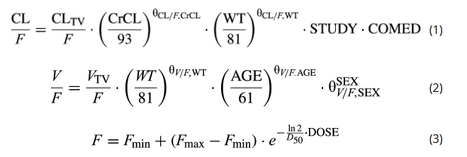 where CL denotes drug clearance,CrCL denotes creatinine clearance,WT denotes body weight,AGE denotes biologic age (in years),F denotes relative oral bioavailability,Fmin and Fmax are estimated parameters,TV subscript denotes the typical (population) value,DOSE denotes the administered dose of rivaroxaban (in milligrams),STUDY denotes effect of the type of study,COMED denotes effect of drug‒drug interactions between rivaroxaban and certain comedications